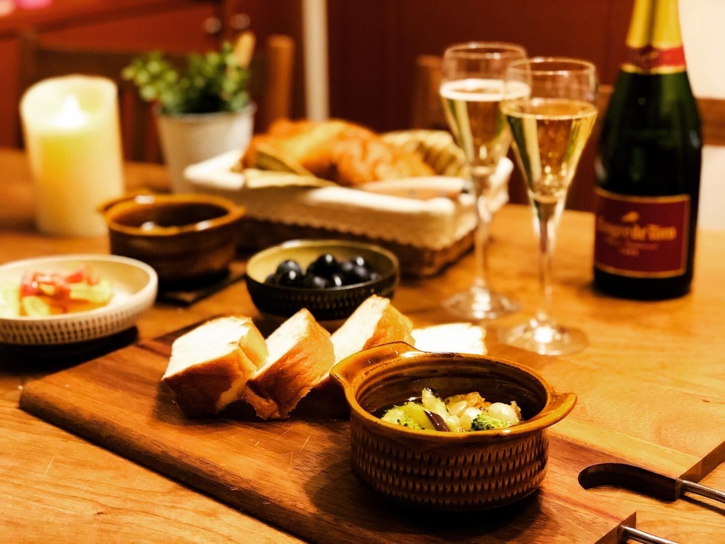 一人分のグラタンをスープやサラダやパンなどと一緒に、