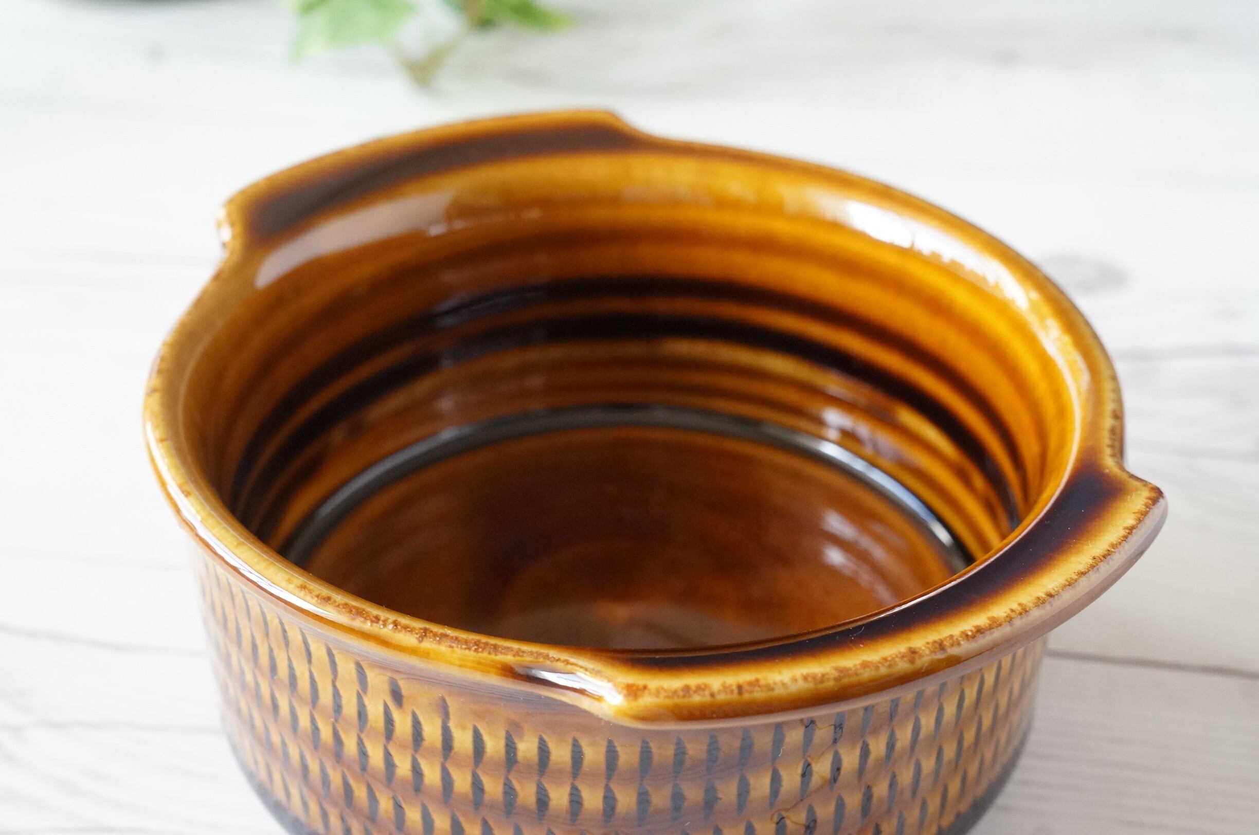 飴釉を施し、表面はうっとりするような濃いブラウンに淡い模様が加わり、