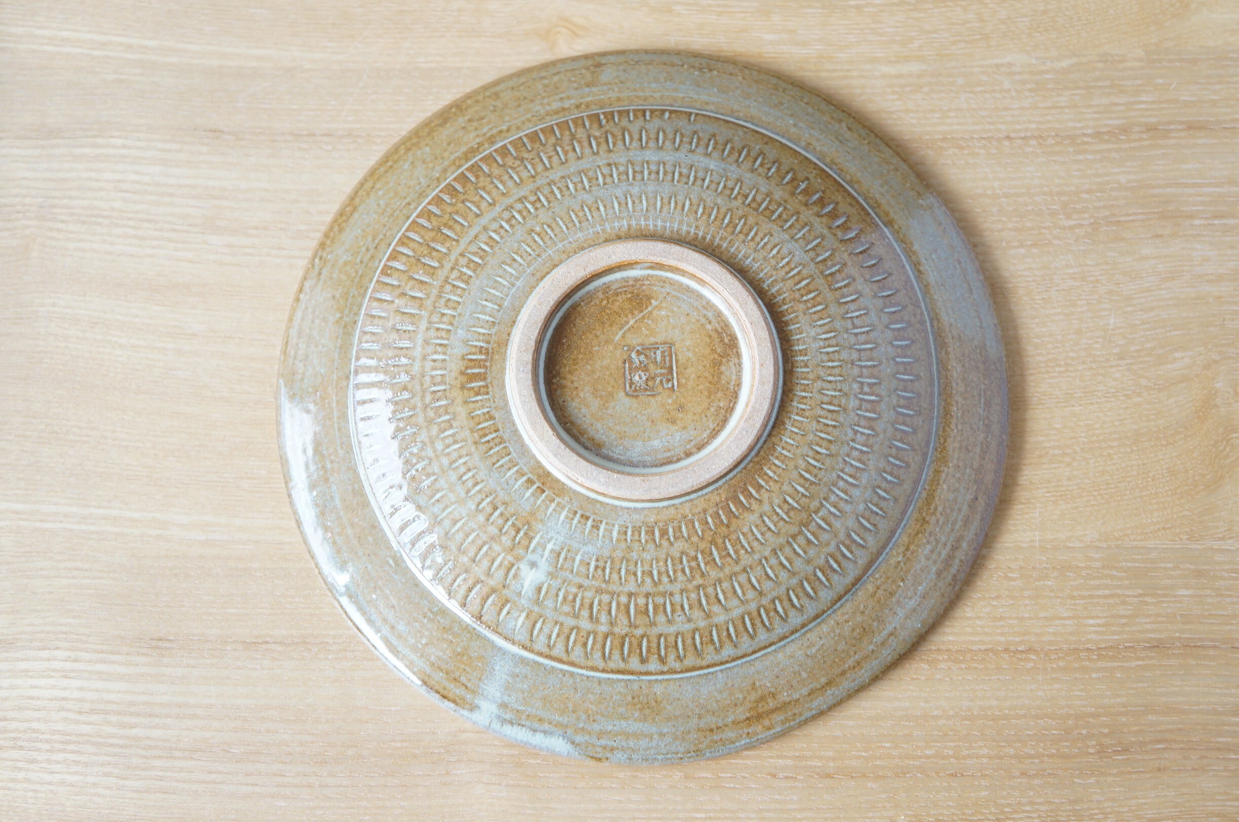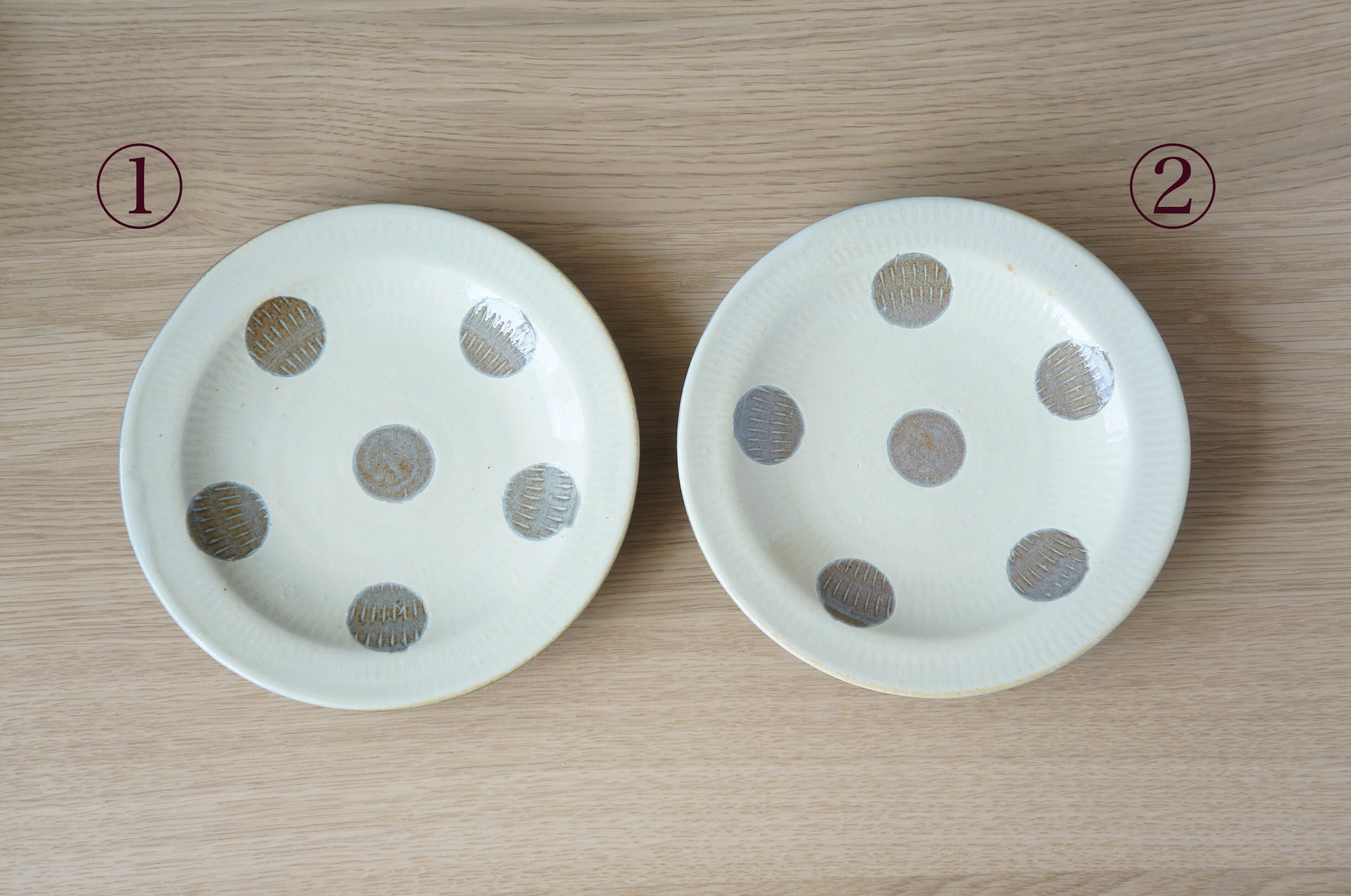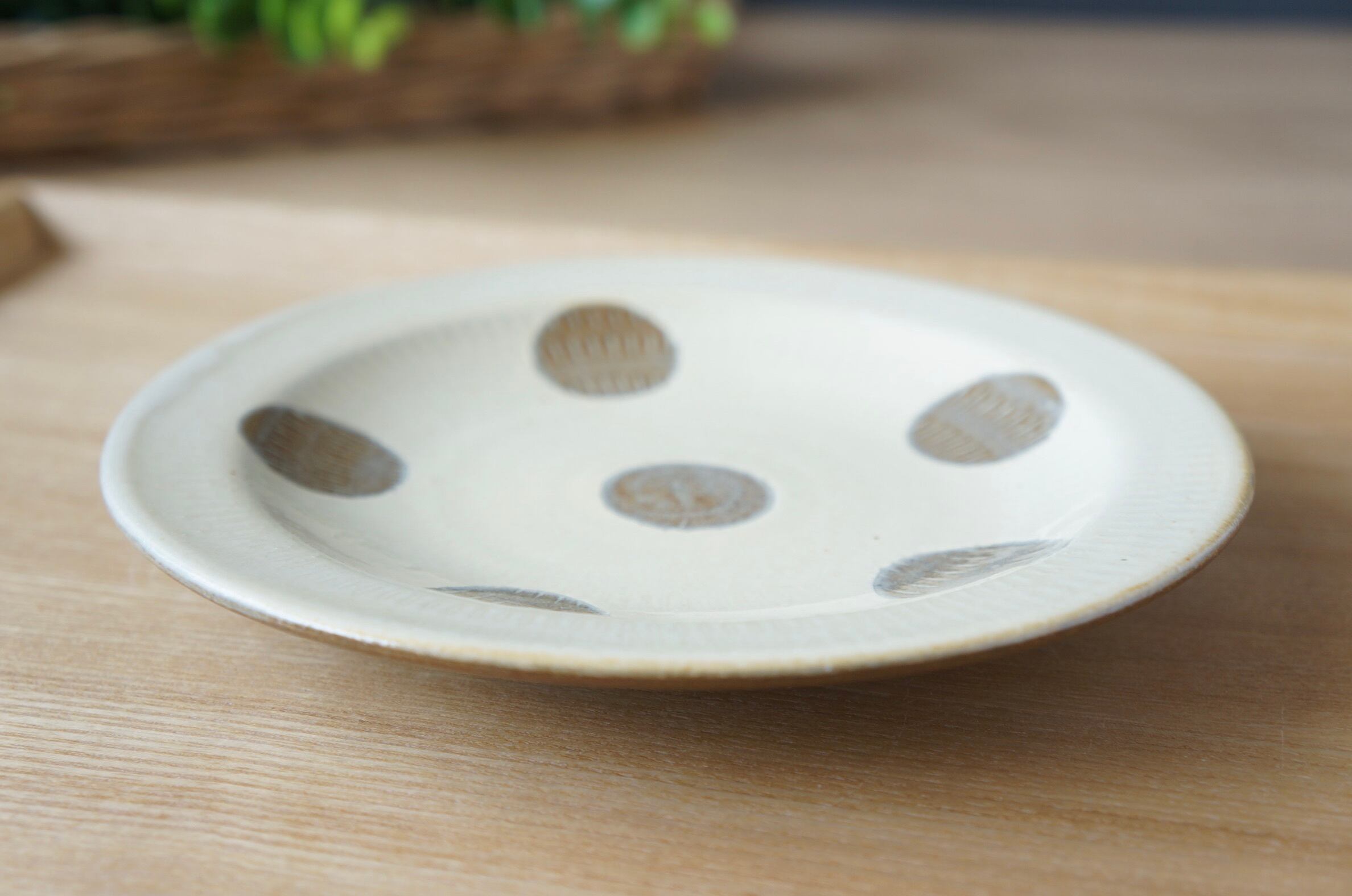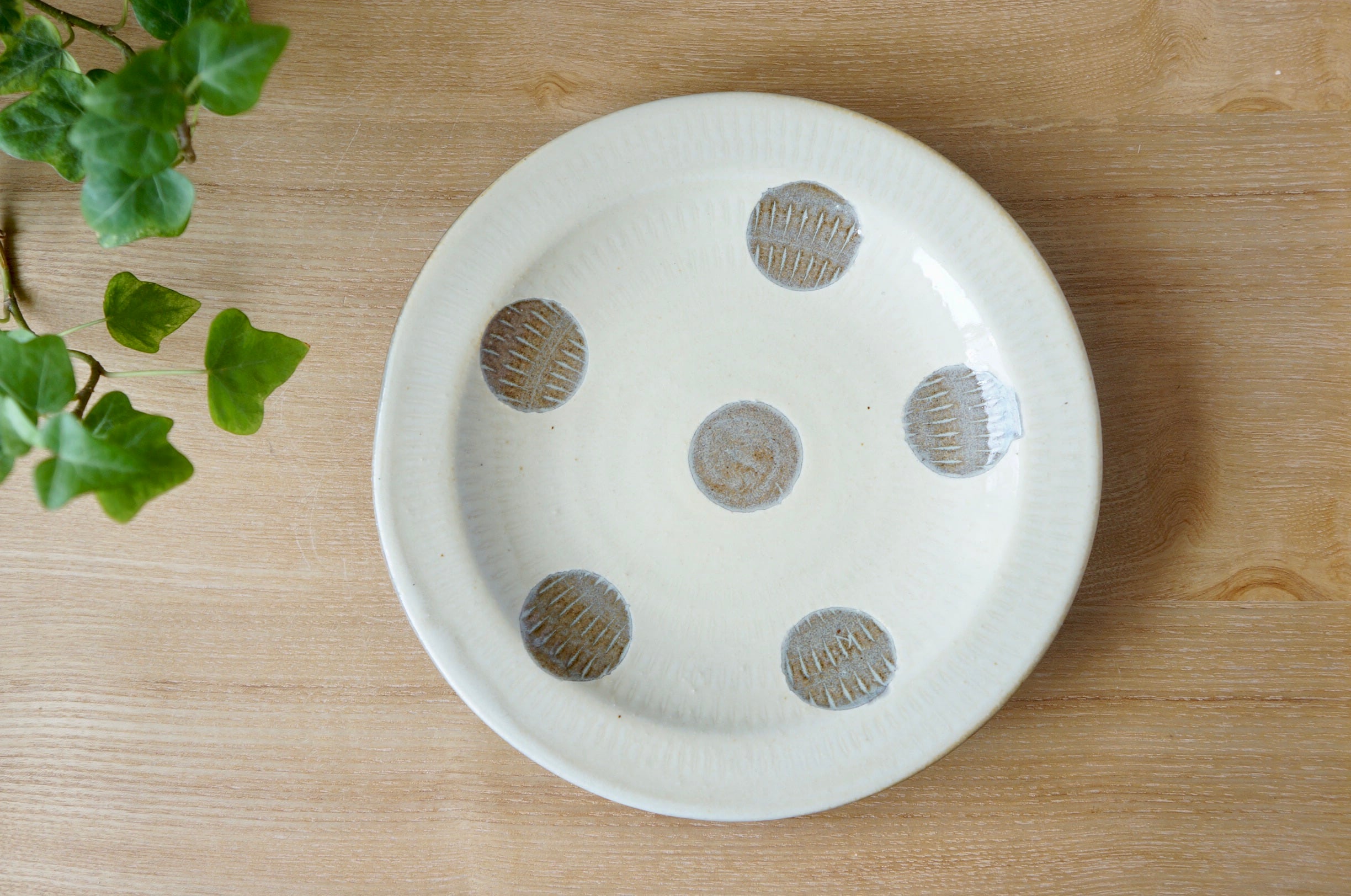 小石原焼 翁明窯元 リムつき5.5寸皿 水玉・白釉 ①【37-462】