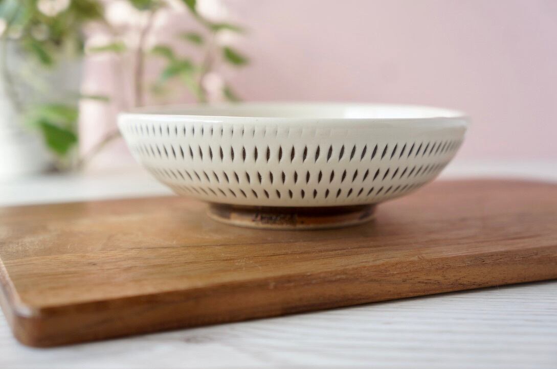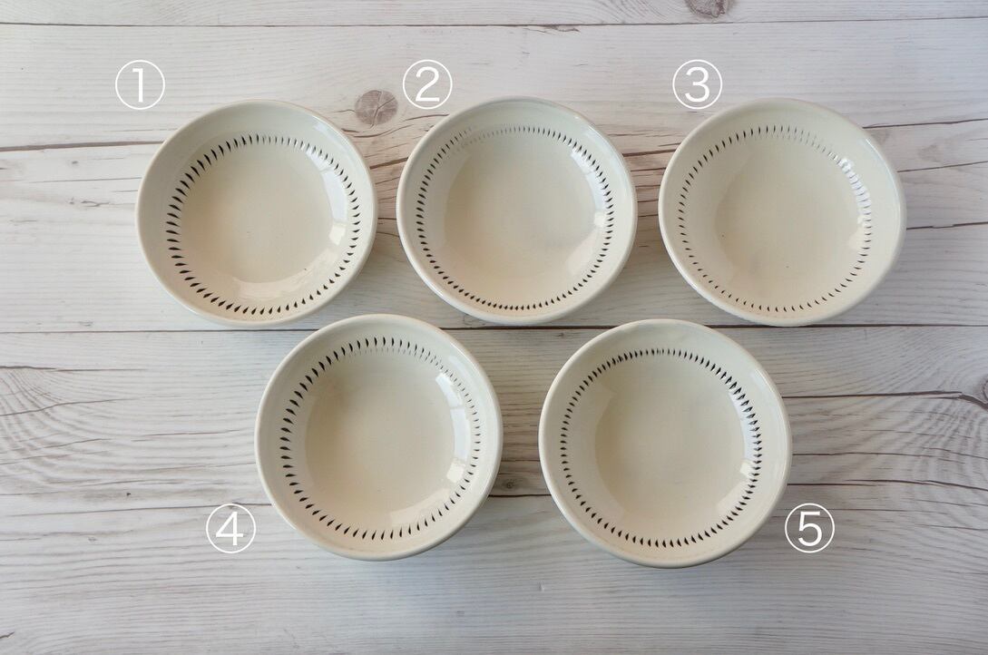 シンプルなデザインの中にもアクセントがある平小鉢です。