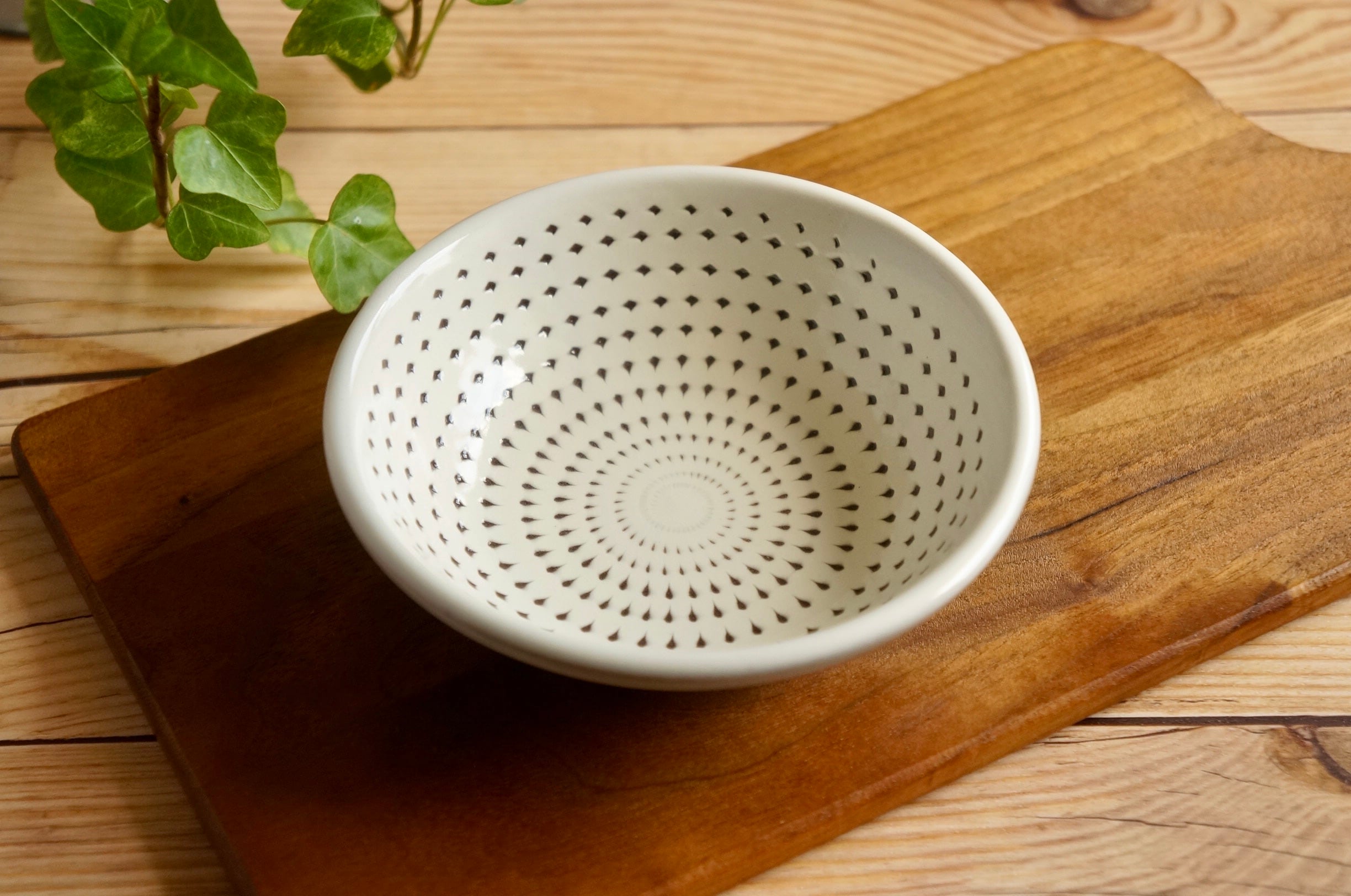 福嶋製陶さんのとびかんなは、まるで雨のしずくのように見える点々模様が特徴で、どこか北欧風の雰囲気も感じられるお洒落な小鉢です♪